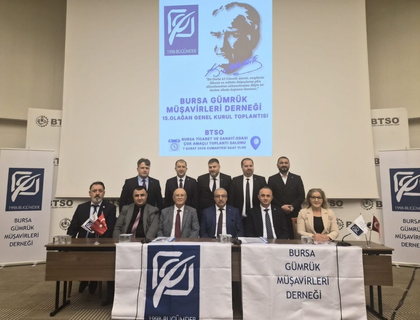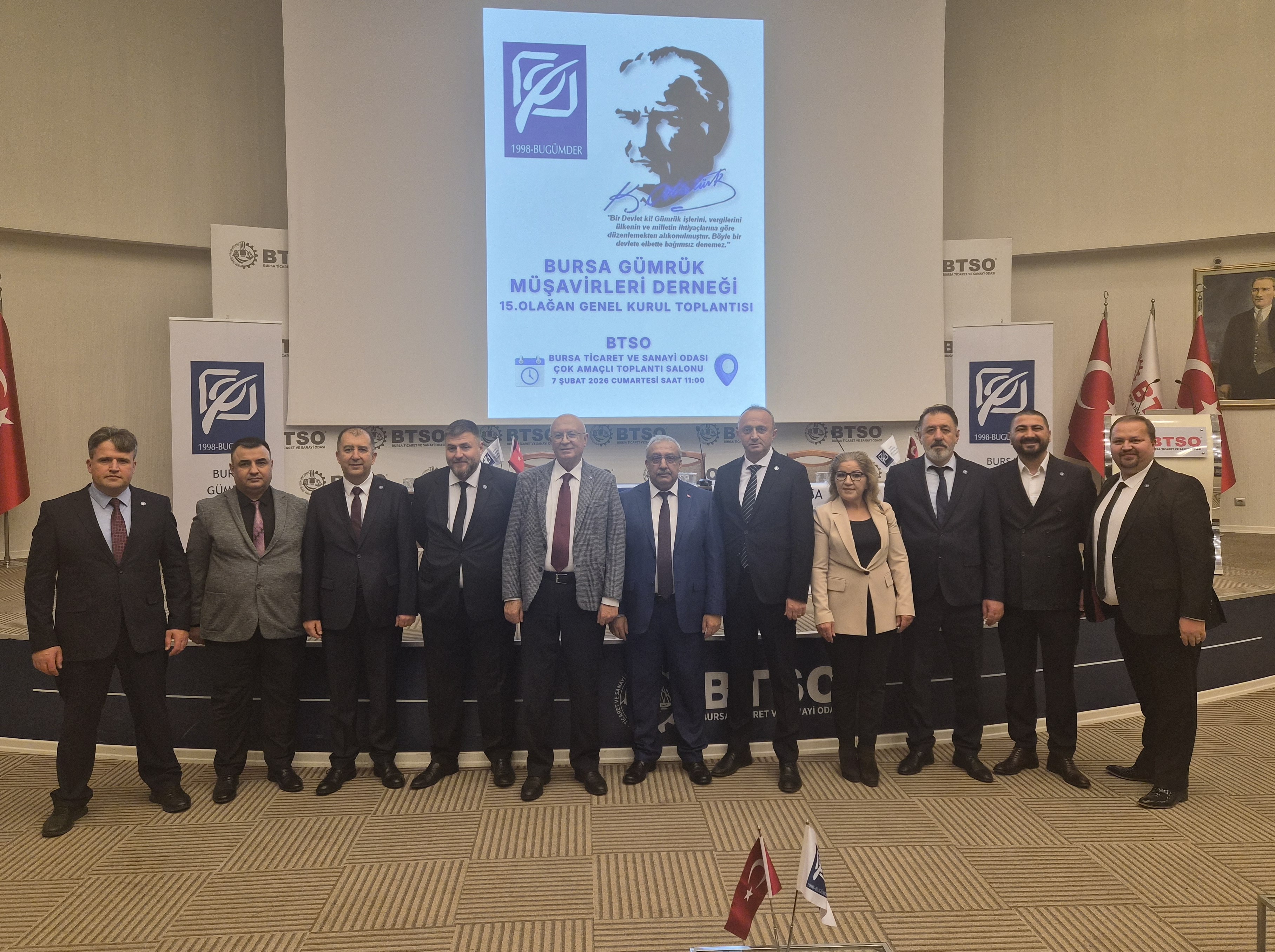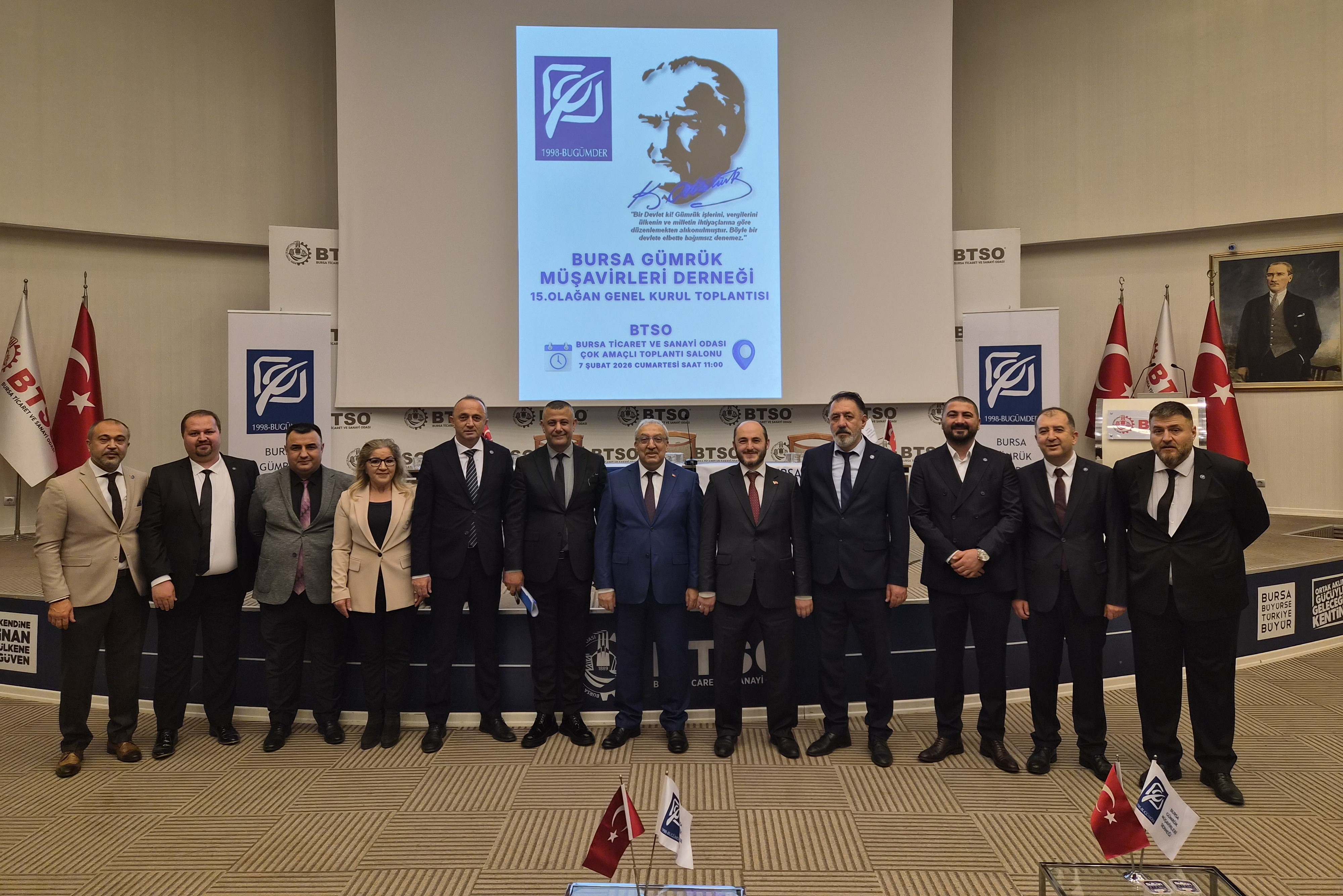 07 Şubat 2026 Cumartesi günü saat 11:00’de BTSO Bursa Ticaret ve Sanayi Odası Çok Amaçlı Toplantı Salonunda gerçekleştirmiş olduğumuz Seçimli 15. Olağan Genel Kurulumuz Bursa Gümrük Müşavirlerine yaraşır bir şekilde sonuçlanmıştır.