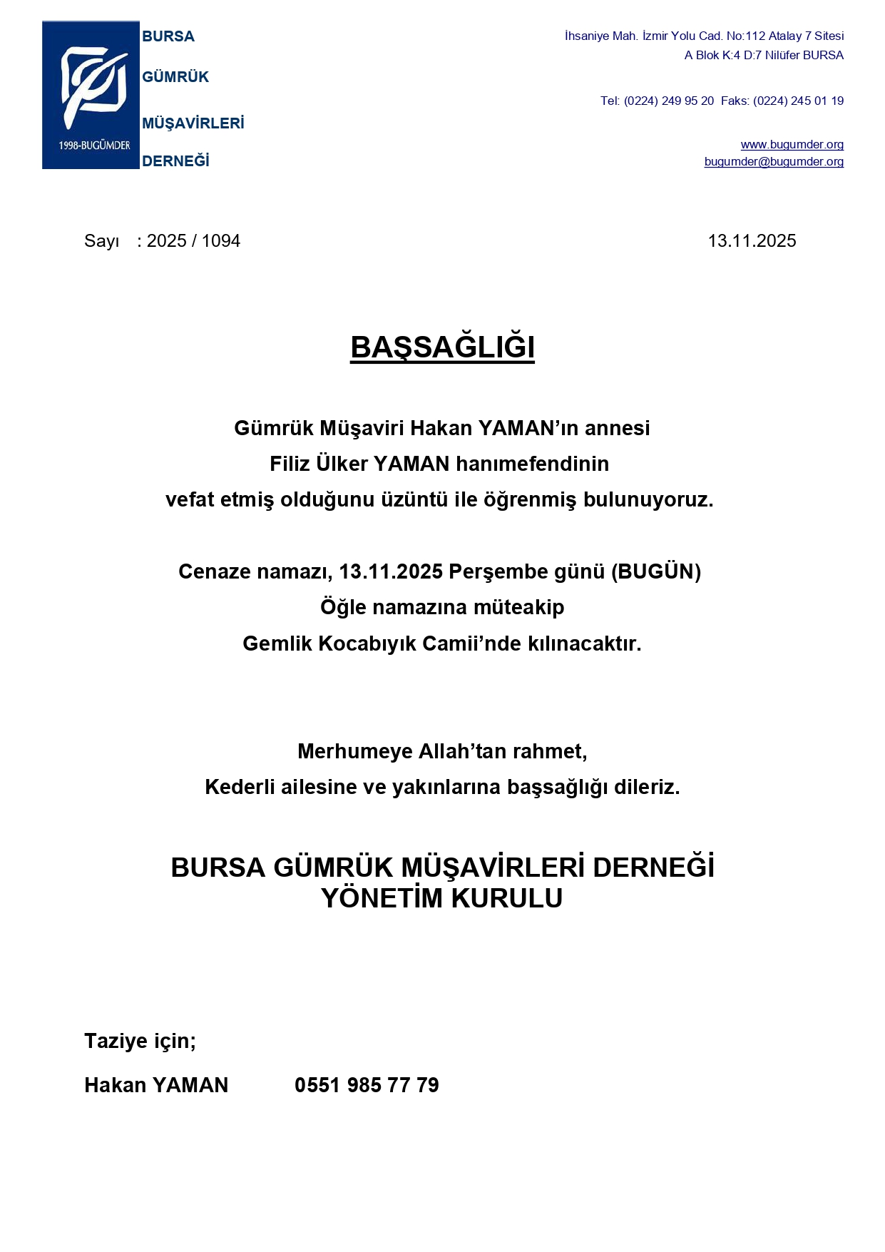 BAŞSAĞLIĞI!... Güm. Müş. Hakan YAMAN'ın annesi Filiz Ülker YAMAN'ın vefatı