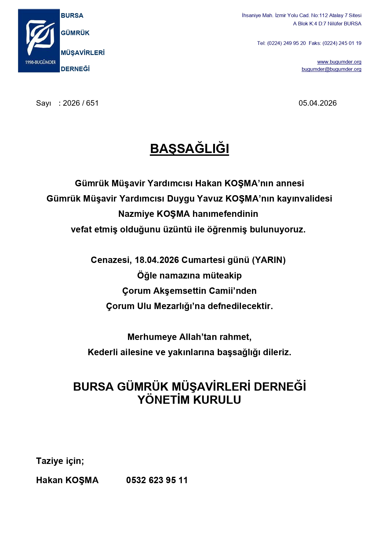 BAŞSAĞLIĞI!... Güm.Müş.Yard. Hakan KOŞMA'nın Güm.Müş.Yard. Duygu Yavuz KOŞMA'nın kayınvalidesi Nazmiye KOŞMA hanımefendinin vefatı