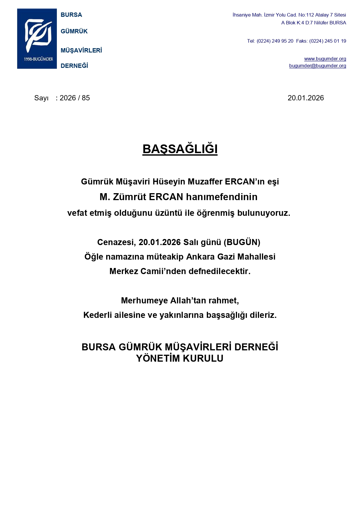 BAŞSAĞLIĞI!... Gümrük Müşaviri Hüseyin Muzaffer ERCAN'ın eşi M. Zümrüt ERCAN hanımefendinin vefatı