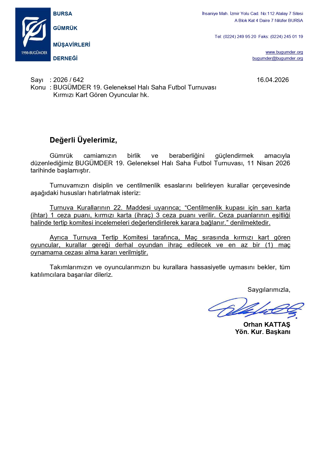 BUGÜMDER 19. GELENEKSEL HALI SAHA FUTBOL TURNUVASI KURAL İHLALİ KIRMIZI KART GÖREN OYUNCULAR HK.