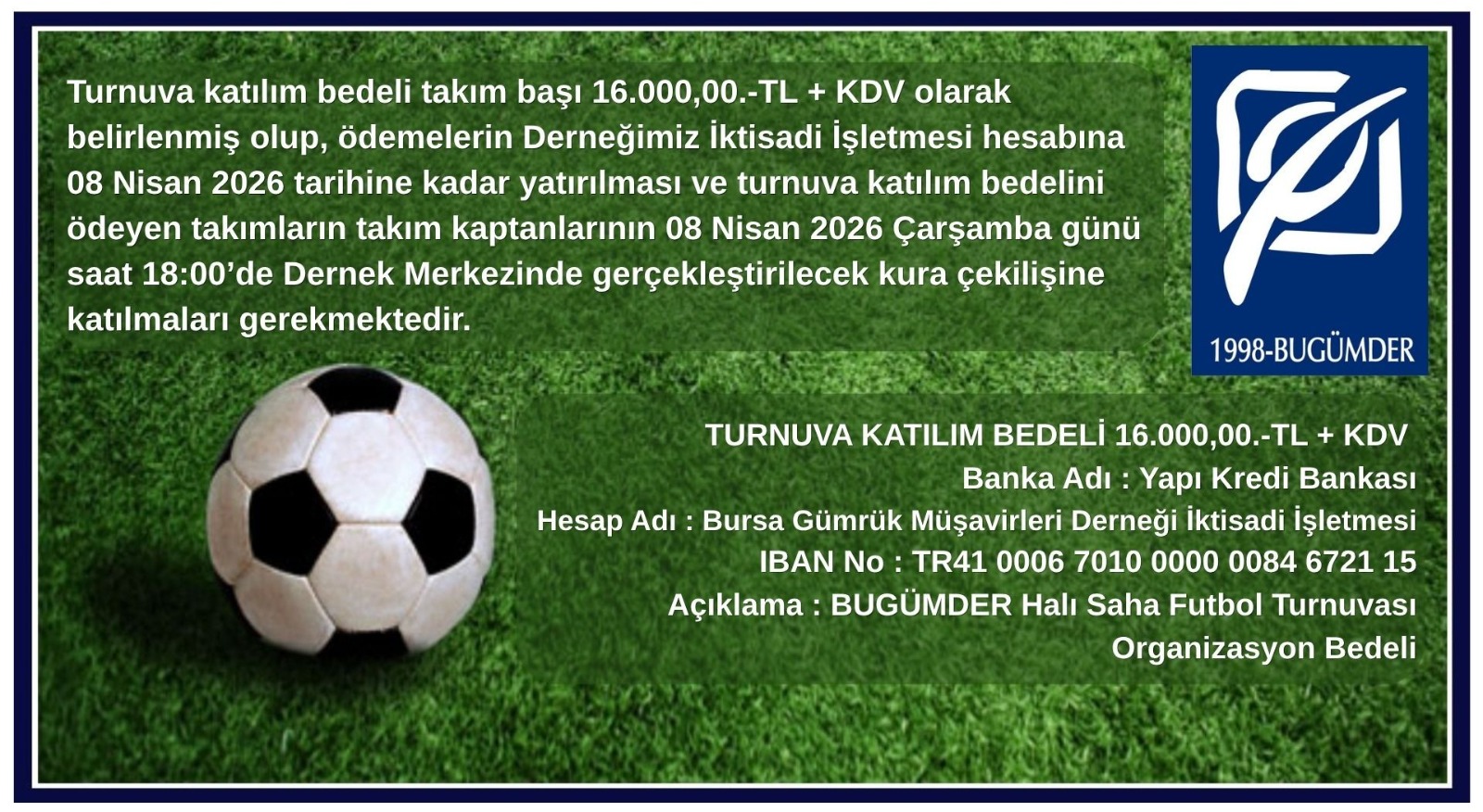 Buna göre; Turnuva katılım bedeli takım başı 16.000,00.-TL + KDV olarak belirlenmiş olup, ödemelerin aşağıda bulunan Derneğimiz İktisadi İşletmesi hesabına 08 Nisan 2026 tarihine kadar yatırılması ve turnuva katılım bedelini ödeyen takımların takım kaptanlarının 08 Nisan 2026 Çarşamba günü saat 18:00’de Dernek Merkezinde gerçekleştirilecek kura çekilişine katılmaları gerekmektedir.