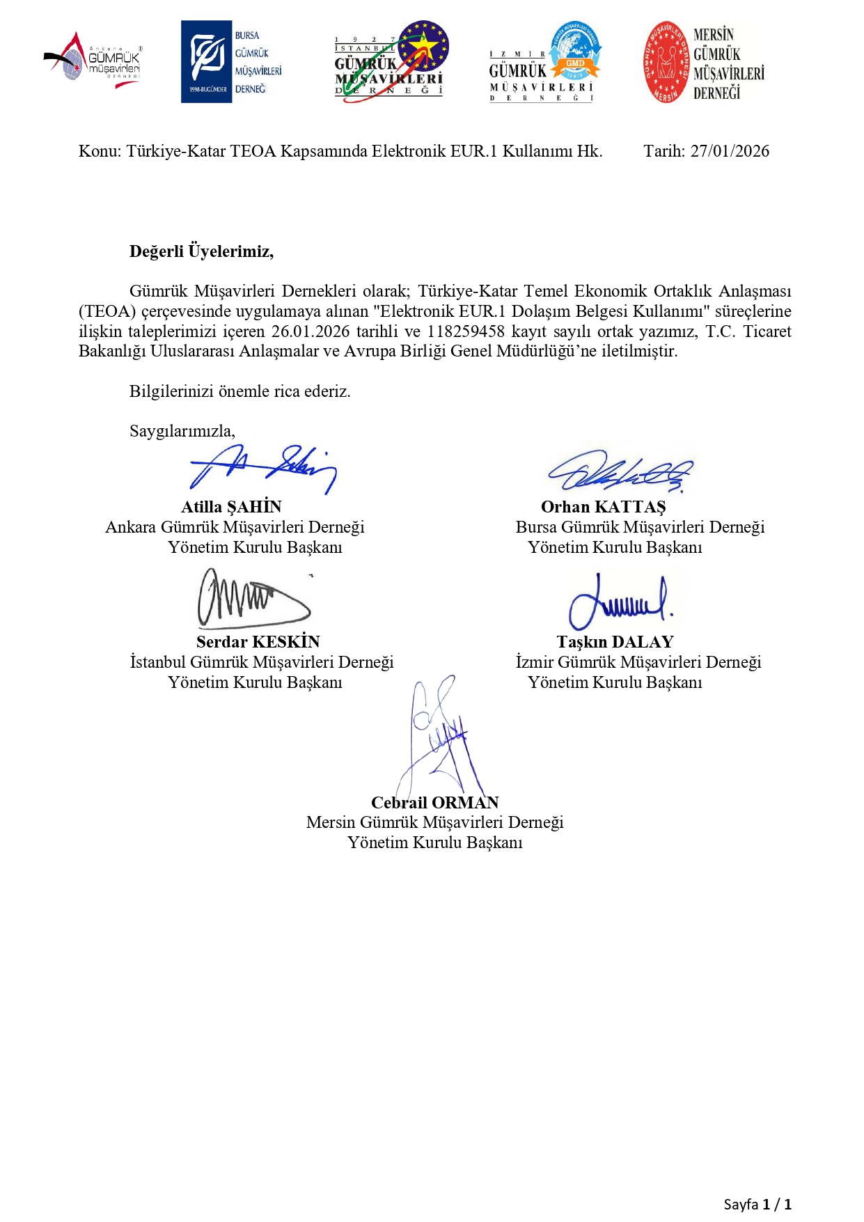 Dernekler ortak duyurusu-Uluslararası Anlve Av.Birl.Gen.Müd.'ne yazılan Türkiye Katar TEOA Kapsamında Elektronik Eur.1 Kullanımı konulu yazı örneği