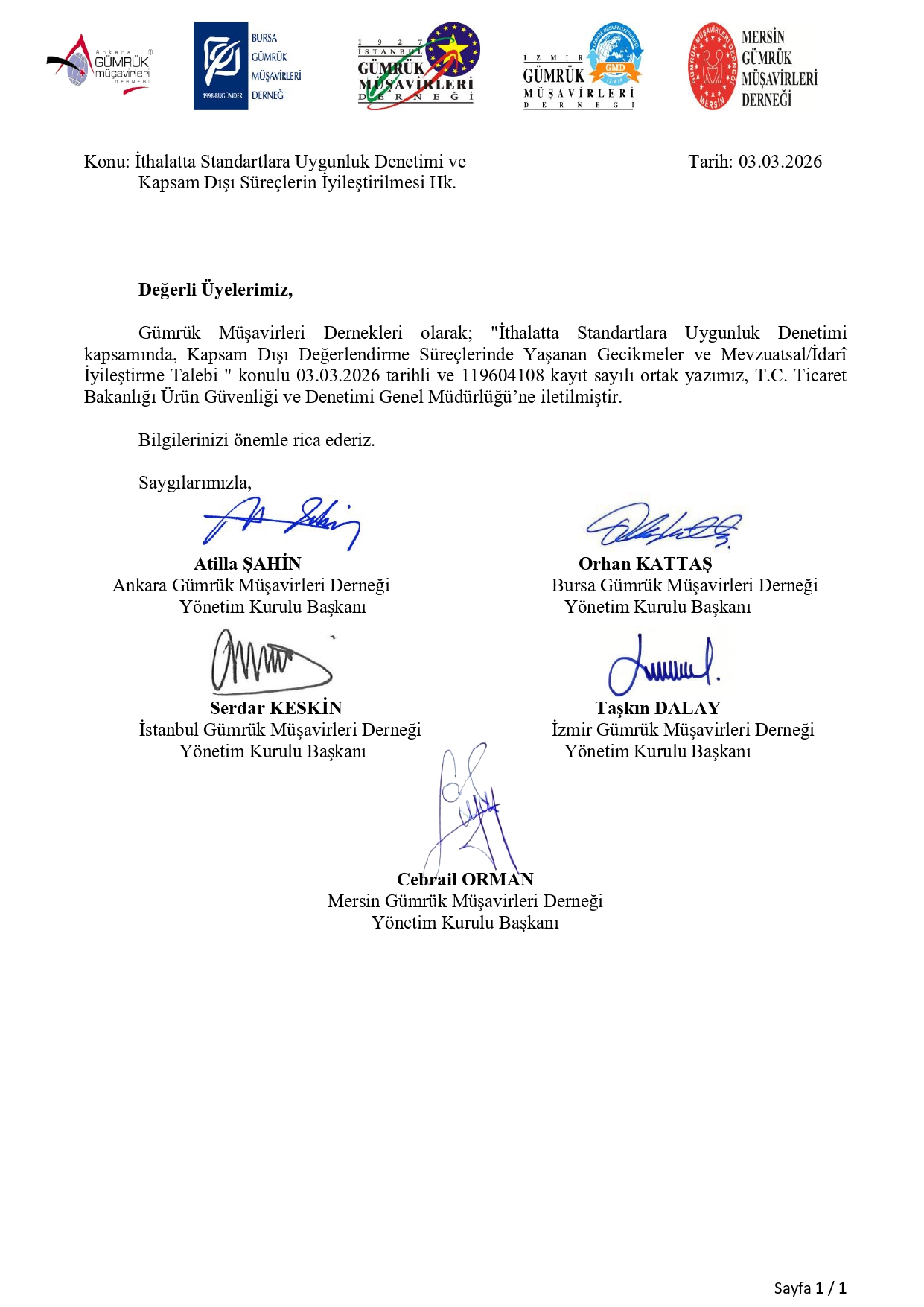 Dernekler ortak duyurusu - Ürün Güv.ve Den.Gen.Müd.'ne yazılan İthalatta Standartlara Uygunluk Denetimi Kapsamında Kapsam Dışı Değerlendirme Süreçleri konulu yazı örneği...