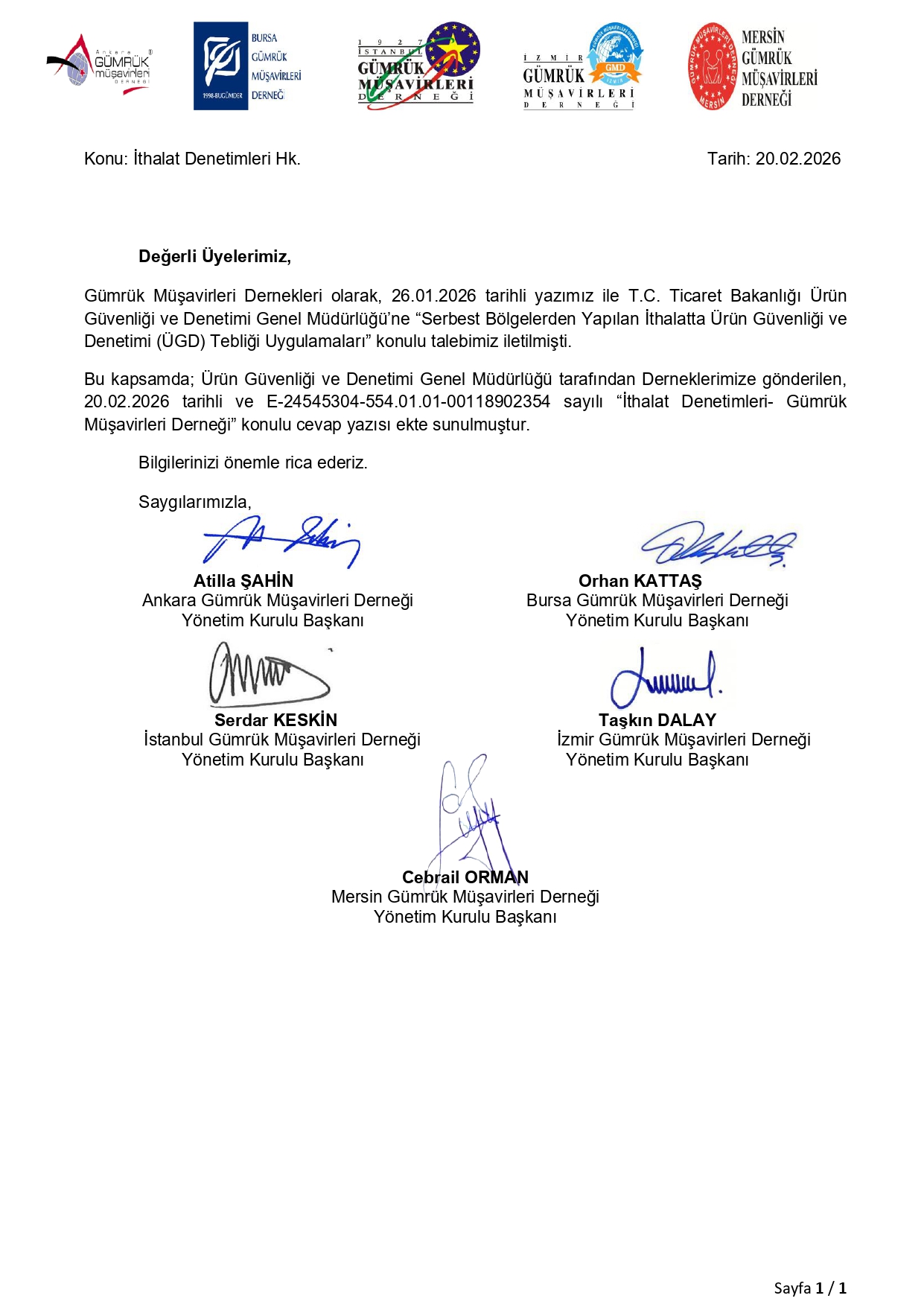 Dernekler ortak duyurusu - Ürün Güvenliği ve Denetimi Gen.Müd.'nün "İthalat Denetimleri – Gümrük Müşavirleri Derneği" konulu cevap yazısı