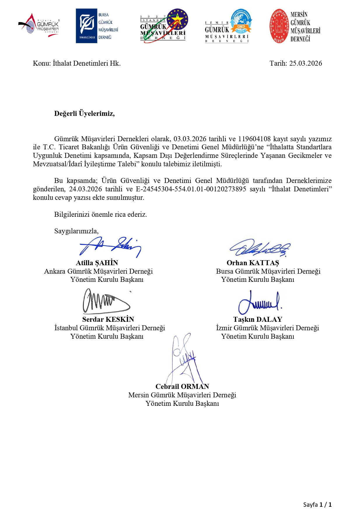 Dernekler ortak duyurusu-Ürün Güvenliği ve Denetimi Gen. Müd'nün "İthalat Denetimleri-Gümrük Müşavirleri Derneği" konulu cevap yazısı örneği
