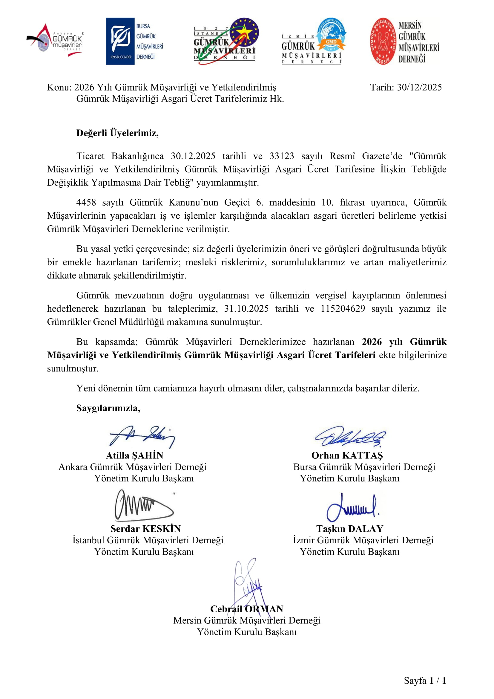 DERNEKLER ORTAK OLARAK BAKANLIĞA SUNULAN 2026 YILI GÜMRÜK MÜŞAVİRLİĞİ VE YETKİLENDİRİLMİŞ GÜMRÜK MÜŞAVİRLİĞİ ASGARİ ÜCRET TARİFESİ