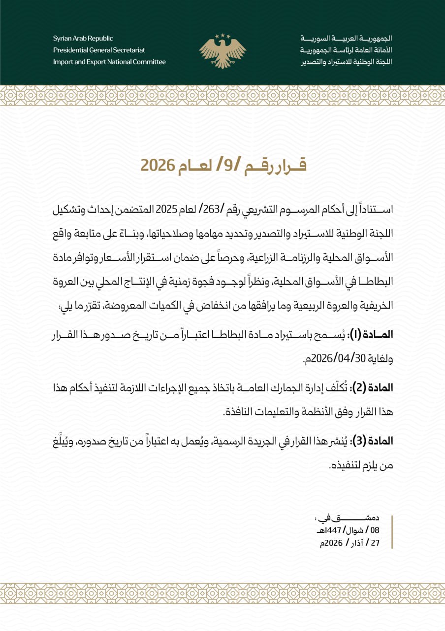 2026-9 Nisan Ayı Patates ithalatına izin verme kararı - Türkçe tercümesi