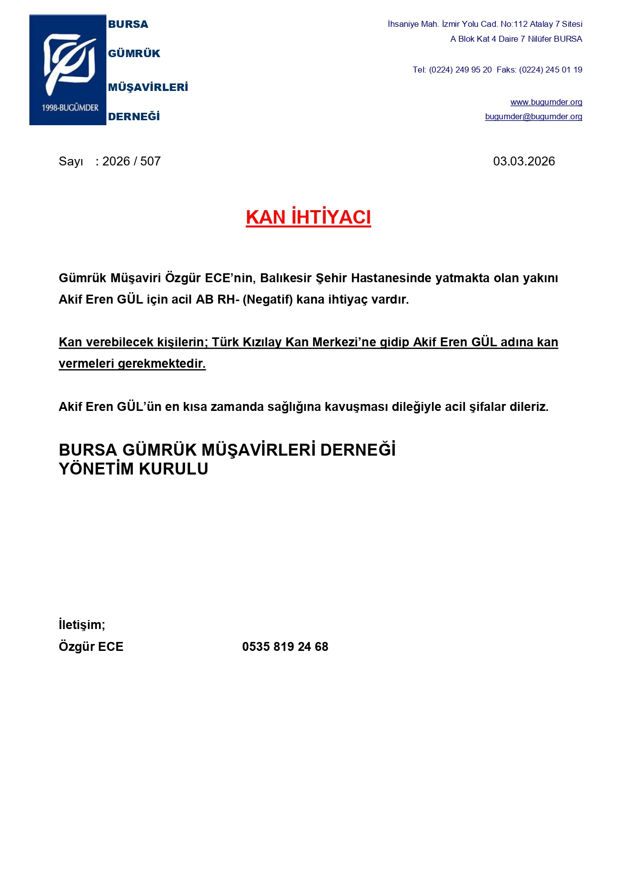 KAN İHTİYACI!...Güm.Müş. Özgür ECE'nin yakını Akif Eren GÜL için AB RH- kan ihtiyacı