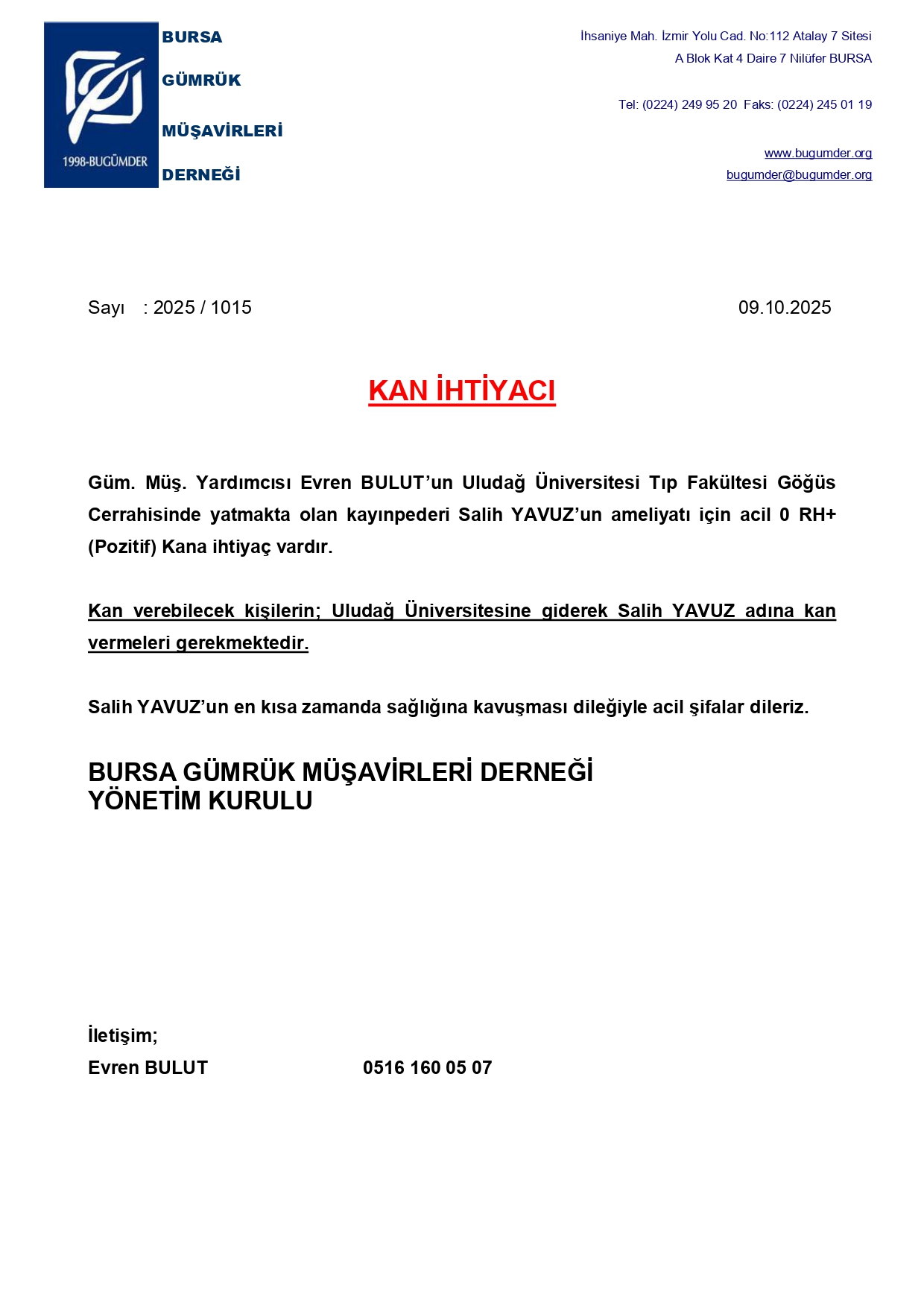 KAN İHTİYACI!... Güm. Müş. Yard. Evren BULUT'un kayınpederi Salih YAVUZ için 0 RH+ kan ihtiyacı