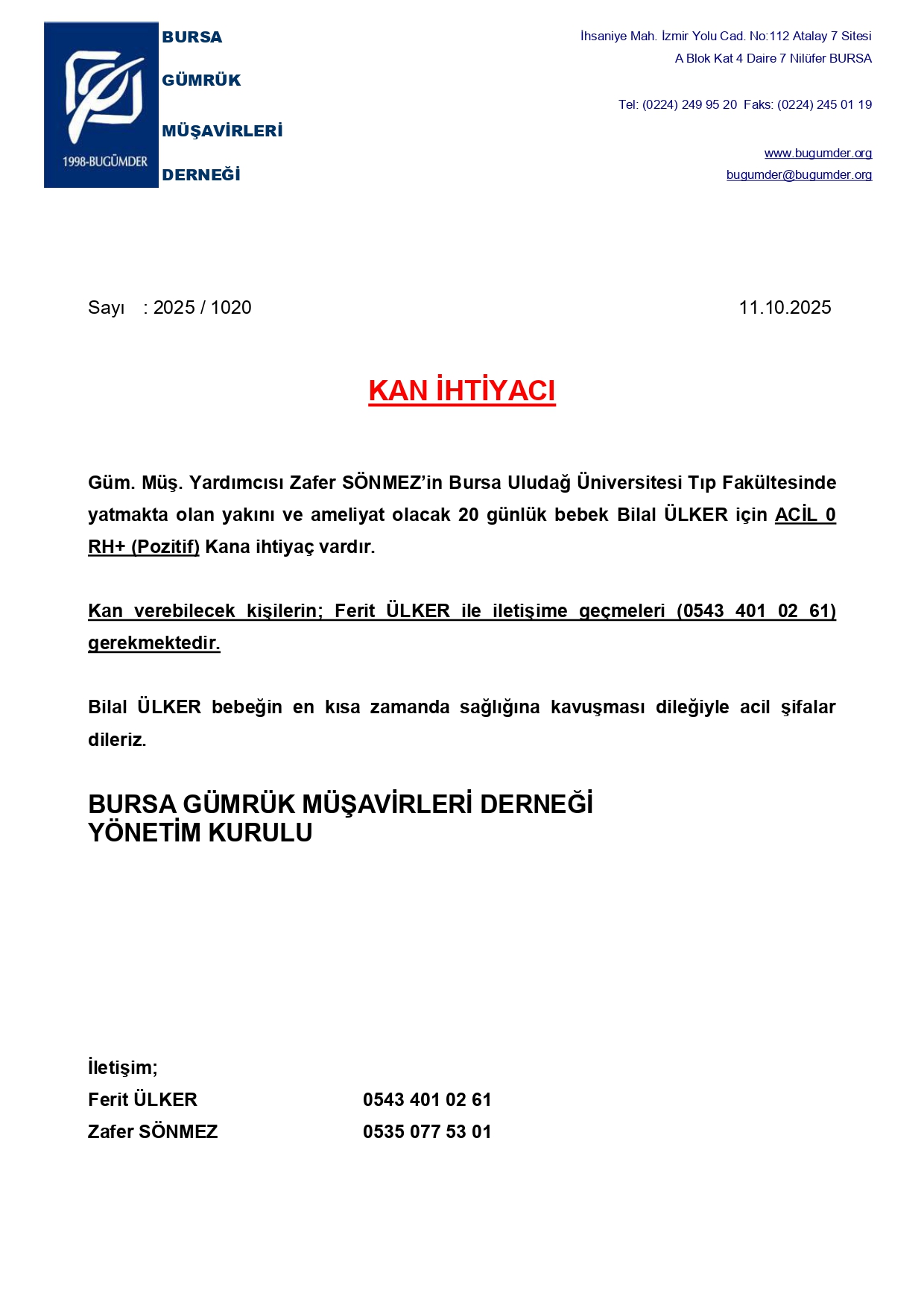 KAN İHTİYACI!... Güm. Müş. Yard. Zafer SÖNMEZ'in yakını 20 günlük bebek Bilal ÜLKER için 0 RH+ kan ihtiyacı