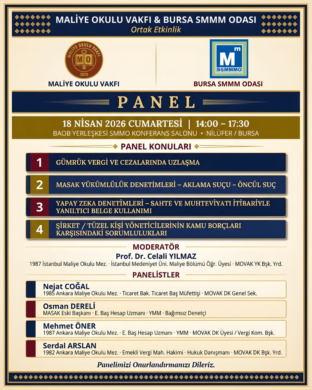 Maliye Okulu Vakfı ve Bursa SMMM Odası’nın 18 Nisan 2026 Cumartesi günü 14:00-17:30 saatleri arasında BAOB Yerleşkesi SMMO Konferans Salonunda ücretsiz gerçekleştireceği ve “Gümrük Vergi ve Cezalarında Uzlaşma” konusunun da yer aldığı Panel ile ilgili duyuru daveti ekte bilgilerinize sunulmuştur.