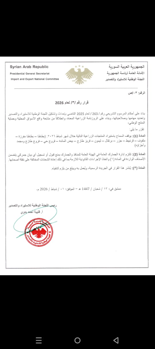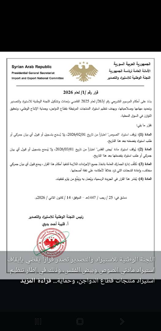 T.C. Ticaret Bakanlığı Gümrükler Genel Müdürlüğü’nden gelen 06.02.2026 tarihli E-52707093-724.01.03-00118734397 sayılı “Suriye’ye İthalatı Yasaklanan Ürünler” konulu yazı ekte bilgilerinize sunulmuştur.