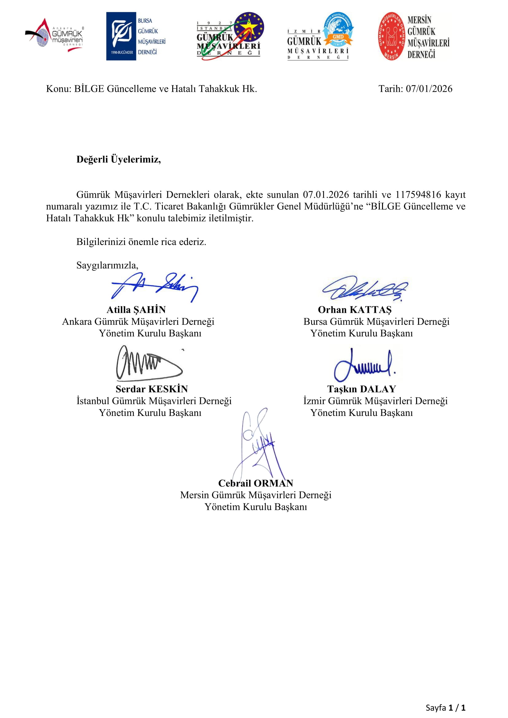 Dernekler ortak duyurusu - Gümrükler Genel Müdürlüğü'ne yazılan "BİLGE Güncelleme ve Hatalı Tahakkuk" konulu yazı örneği