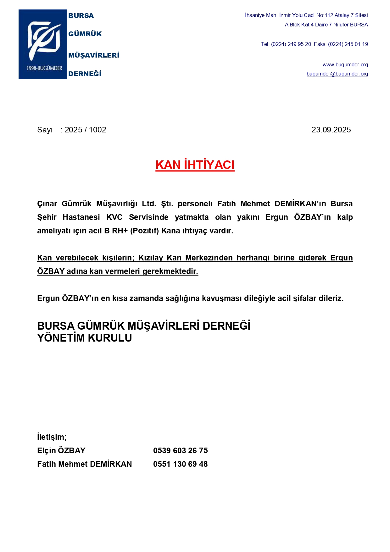 KAN İHTİYACI!.... Çınar Gümrük Müş. Ltd. Şti. personeli Fatih DEMİRKAN'ın yakını Ergun ÖZBAY için B RH+ kan ihtiyacı